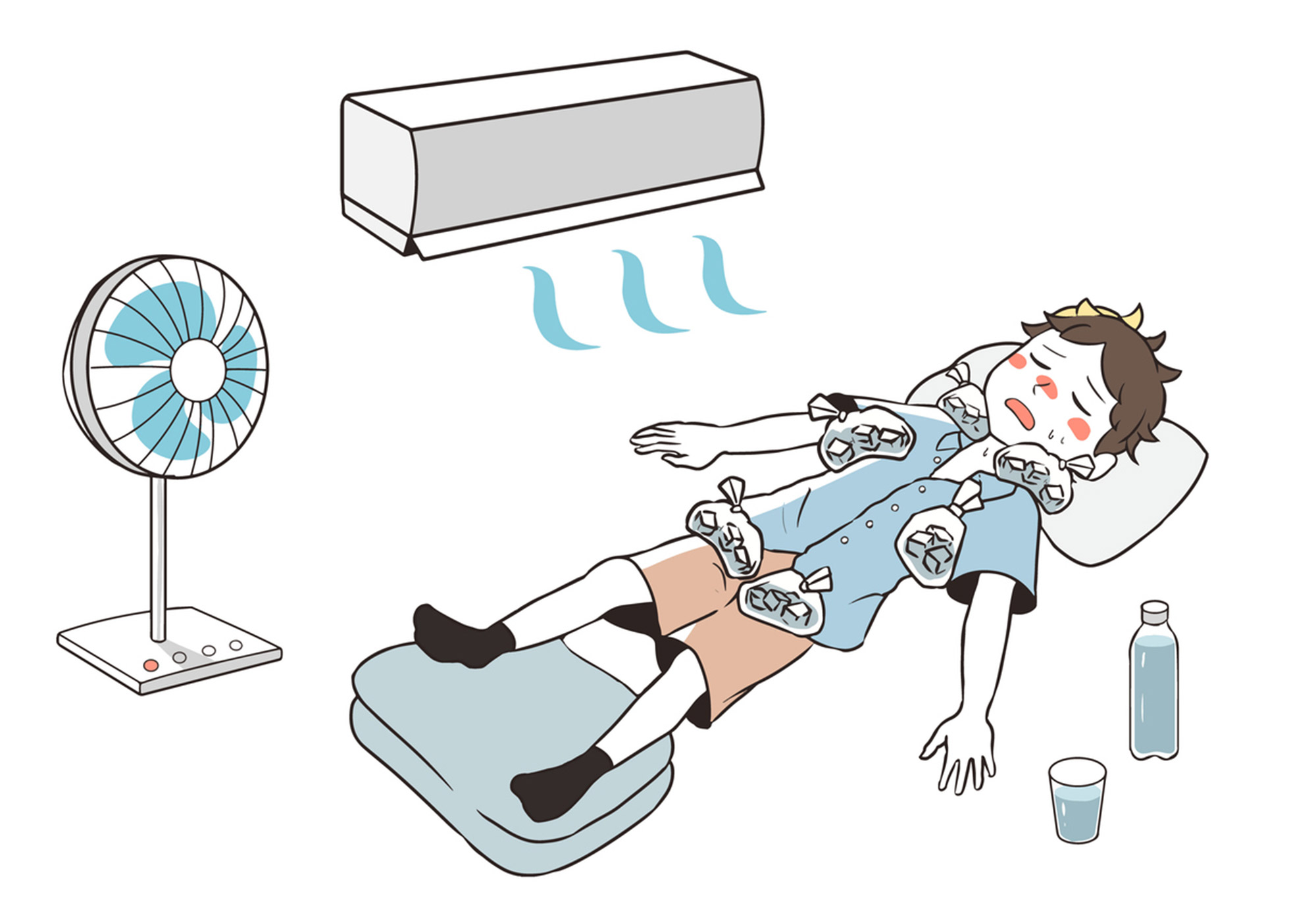 まず、涼しい場所へ移動させ、衣服を緩めて体を冷やします。太ももの付け根や脇の下など、大きな血管が通っているところに氷が入った袋を当てて冷やします。うちわや扇風機の風を当ててあげることも効果的です。