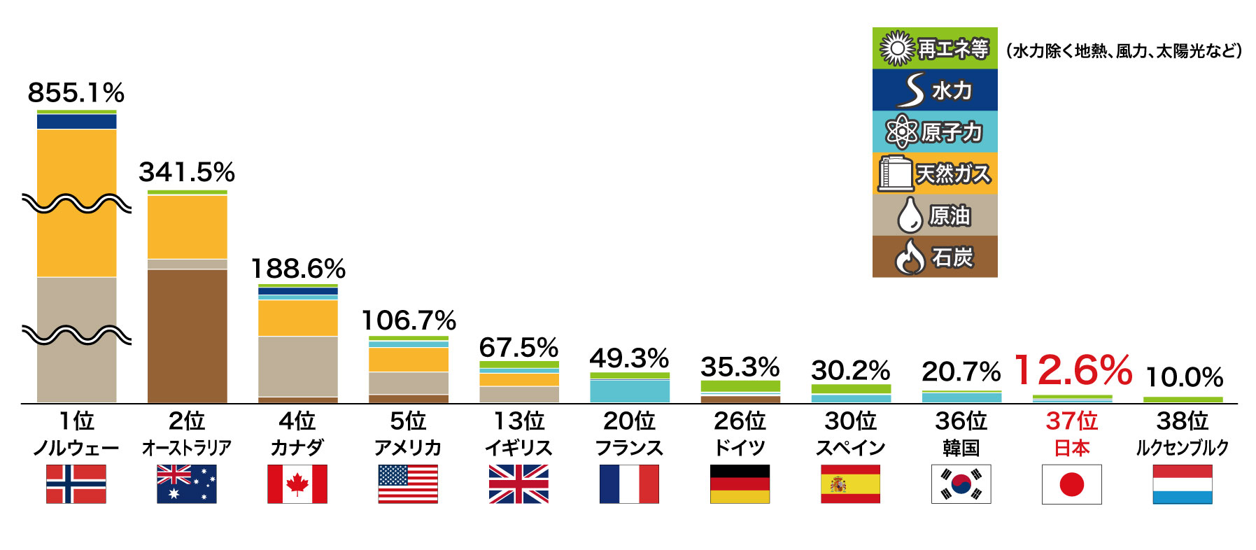 経済産業省・資源エネルギー庁によると、OECD加盟国における一次エネルギー自給率の世界ランキングは下図の通りです。